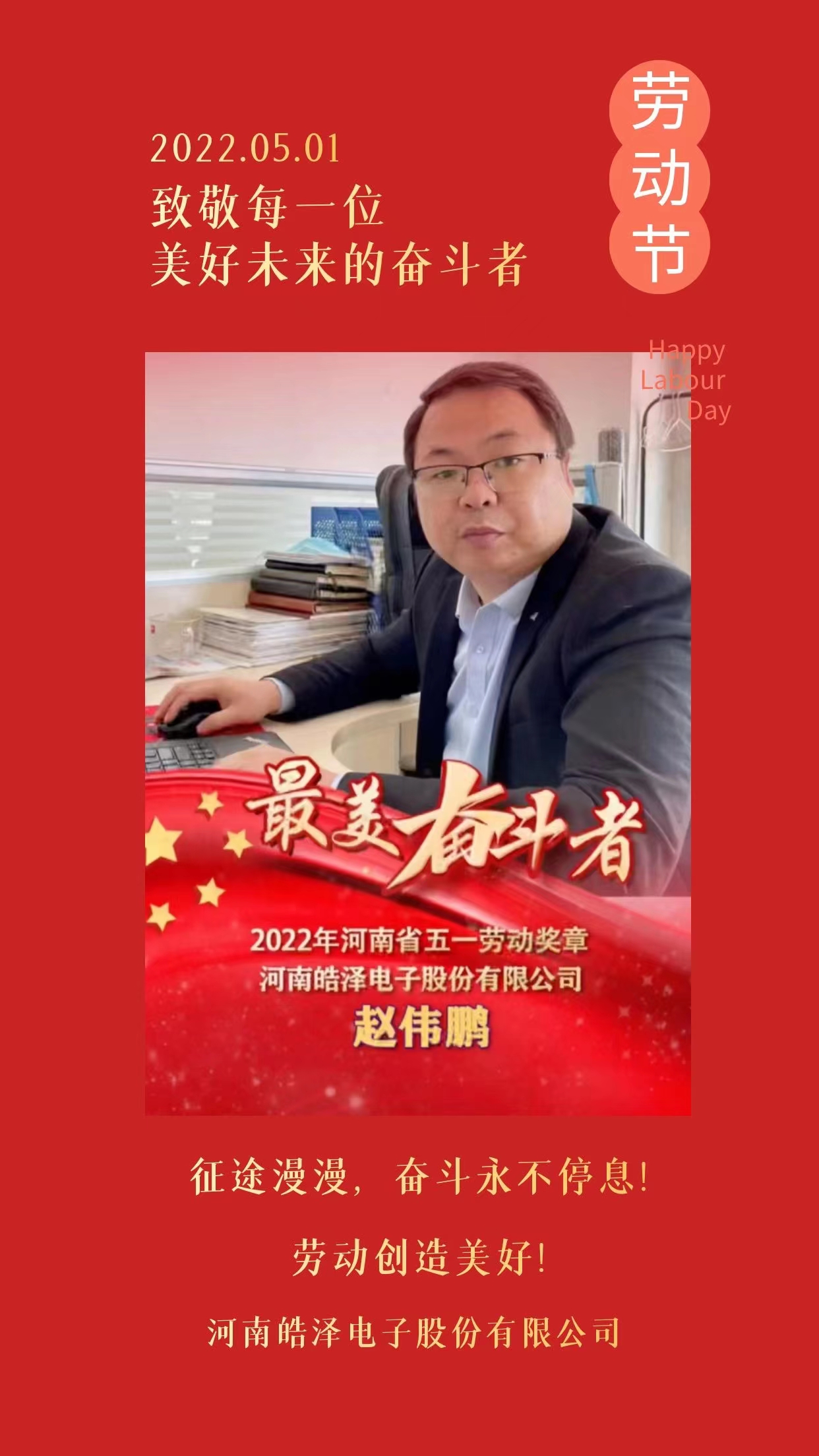 我们深信:以赵总监获得河南省五一劳动奖章的荣耀为契机,秉承奋斗精神,全体皓泽人只要锐意进取、开拓创新、矢志不渝、攻坚克难,一定会为皓泽的璀璨发展明天作出更大的贡献,也一定会唱响劳动最光荣、劳动最崇高、劳动最伟大、劳动最美丽的时代乐章。